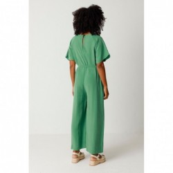 Macacão longo e folgado com decote em V profundo e decote em V em formato de gota nas costas. Possui mangas curtas raglan e práticos bolsos laterais.