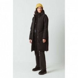 Casaco longo acolchoado de corte reto, confeccionado principalmente em poliéster reciclado com isolamento ecológico DuPont Sorona. Possui capuz ajustável com gola alta, mangas compridas com punhos canelados largos, sistema de ajuste interno na cintura, bolsos e zíper frontal com dois puxadores. Impermeabilidade: 5000 mm; respirabilidade: 3000 g/m²/24h. Tratamento repelente à água sem PFC.