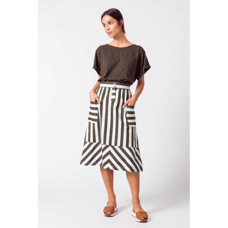 Dê um toque de poder ao seu visual com esta saia midi estampada com um design de painéis listrados.