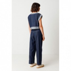 Top cropped sem mangas em denim de algodão orgânico com certificação GOTS. Decote redondo e zíper lateral invisível. Denim cru.
