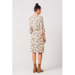 Um vestido acima do joelho, muito feminino e prático, com uma estampa geométrica brilhante de inspiração geológica.