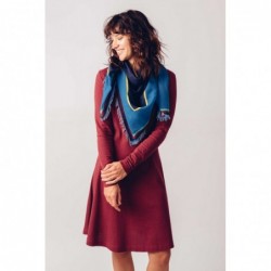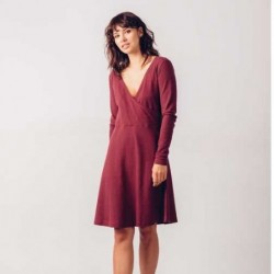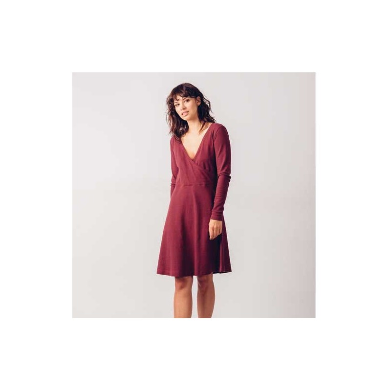 Vestido solto, de corte feminino, que envolve acima do joelho, com decote em V e feito de algodão orgânico macio.