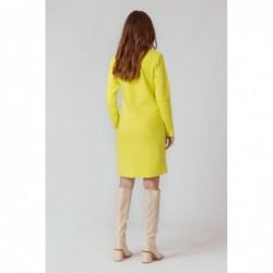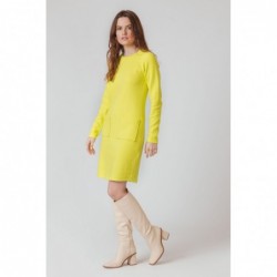 Este vestido de algodão elástico tem comprimento acima do joelho, gola redonda, mangas compridas e dois bolsos frontais. É verde-claro.