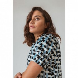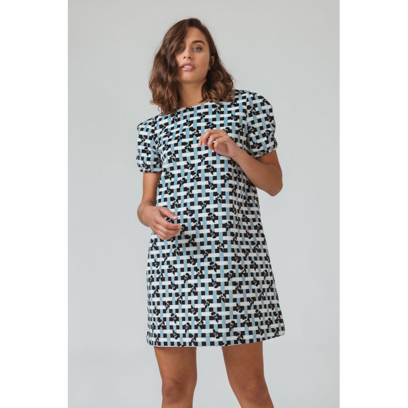 Vestido evasê acima do joelho, confeccionado em algodão orgânico com elastano, gola redonda, mangas curtas com detalhe de pregas na parte superior e bolsos laterais. Estampa floral xadrez. O algodão orgânico é cultivado com métodos e materiais de baixo impacto ambiental. Isso significa que não são utilizados fertilizantes e pesticidas tóxicos, e a fertilidade do solo é mantida. A modelo veste tamanho 38 e tem 1,74 m de altura.