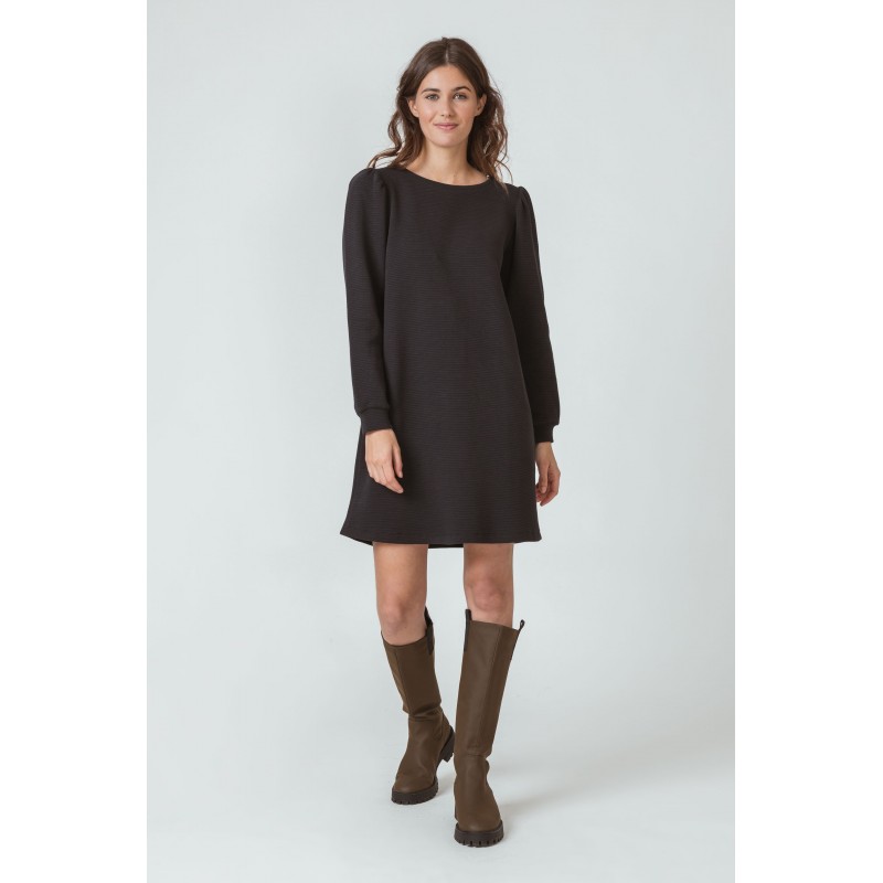 Vestido evasê acima do joelho, confeccionado em algodão orgânico texturizado. Possui gola redonda e mangas compridas. Na cor lilás. O algodão orgânico é cultivado com métodos e materiais de baixo impacto ambiental. Isso significa que não são utilizados fertilizantes e pesticidas tóxicos, e a fertilidade do solo é mantida. A modelo veste tamanho 38 e tem 1,73 m de altura.