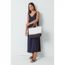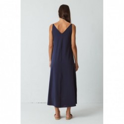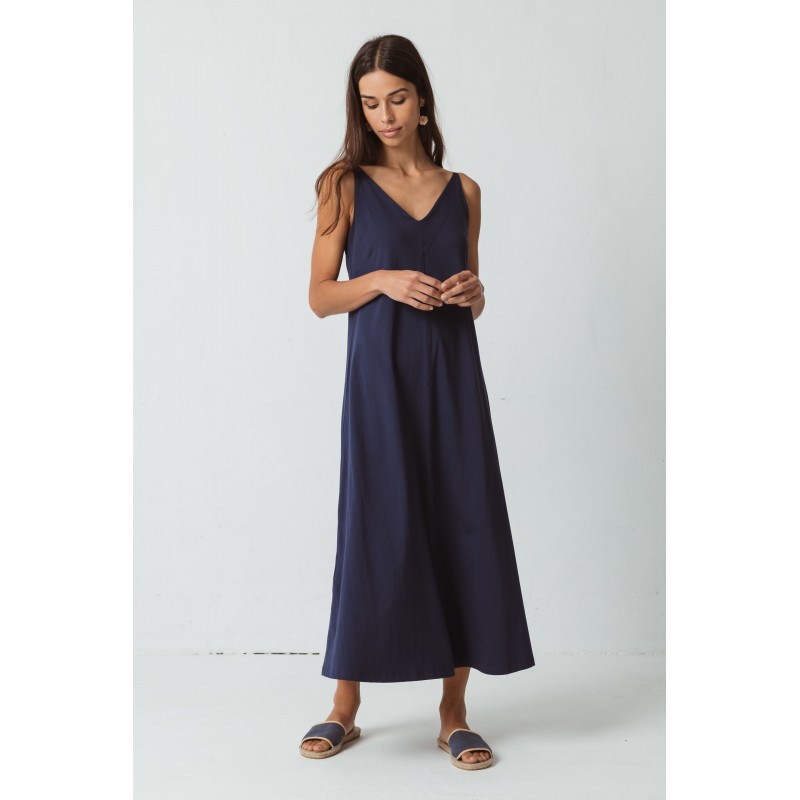Vestido midi evasê. Decote em V, sem mangas e recorte contrastante nos ombros. Tricô.