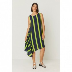 Vestido solto, sem mangas, com decote canoa, corte assimétrico e remendo em um dos lados.