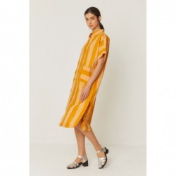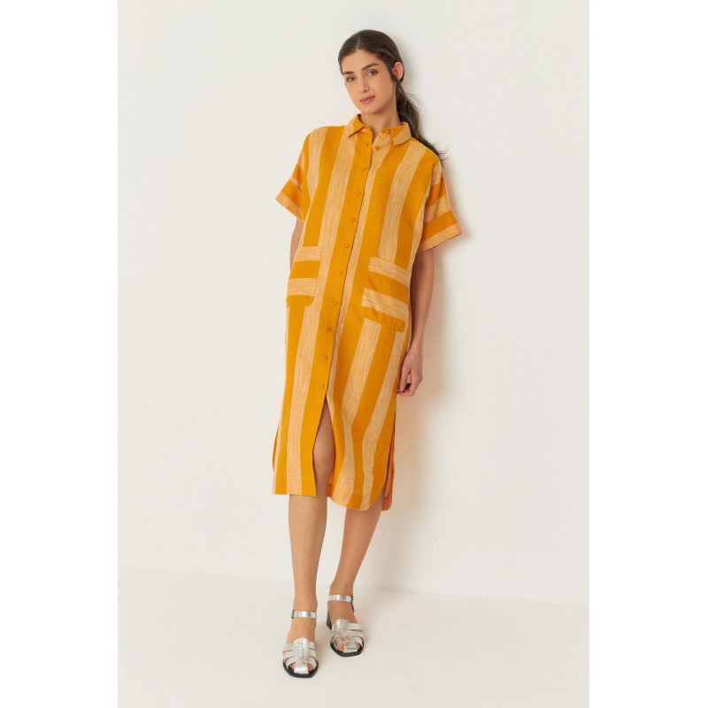 Vestido-camisa casual com ombros caídos. Com gola clássica, bolsos frontais aplicados, fecho por botões e pinças nas costas. As mangas curtas são forradas, o que deixa o tecido decorativo visível quando enrolado.