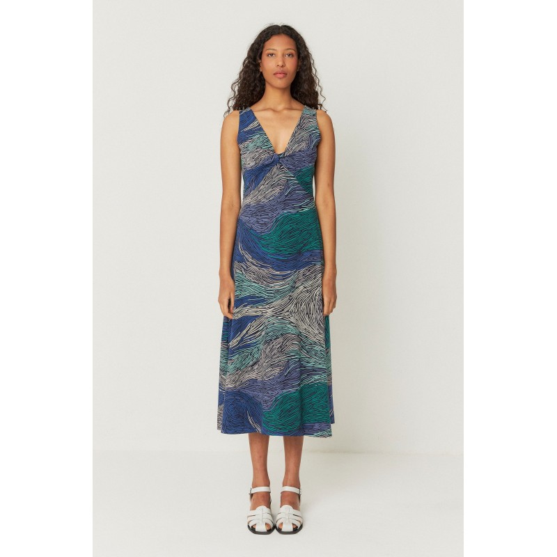 Vestido midi sem mangas, com corte evasê e decote em V. Modelo slip-on fácil de usar.