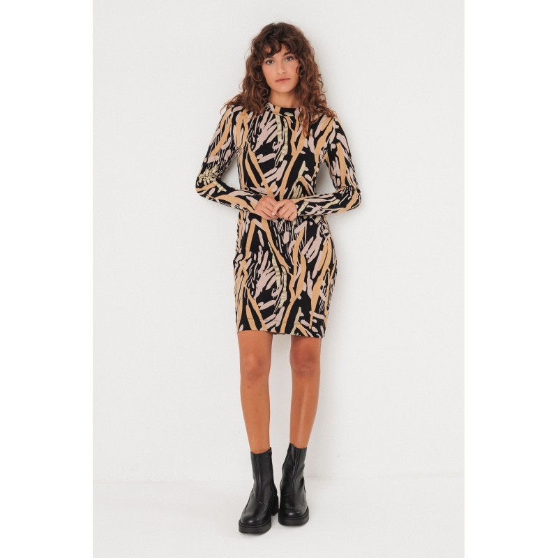 Vestido curto e justo, confeccionado em algodão orgânico elástico, com mangas compridas e gola alta. Fácil de vestir.