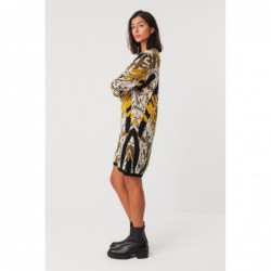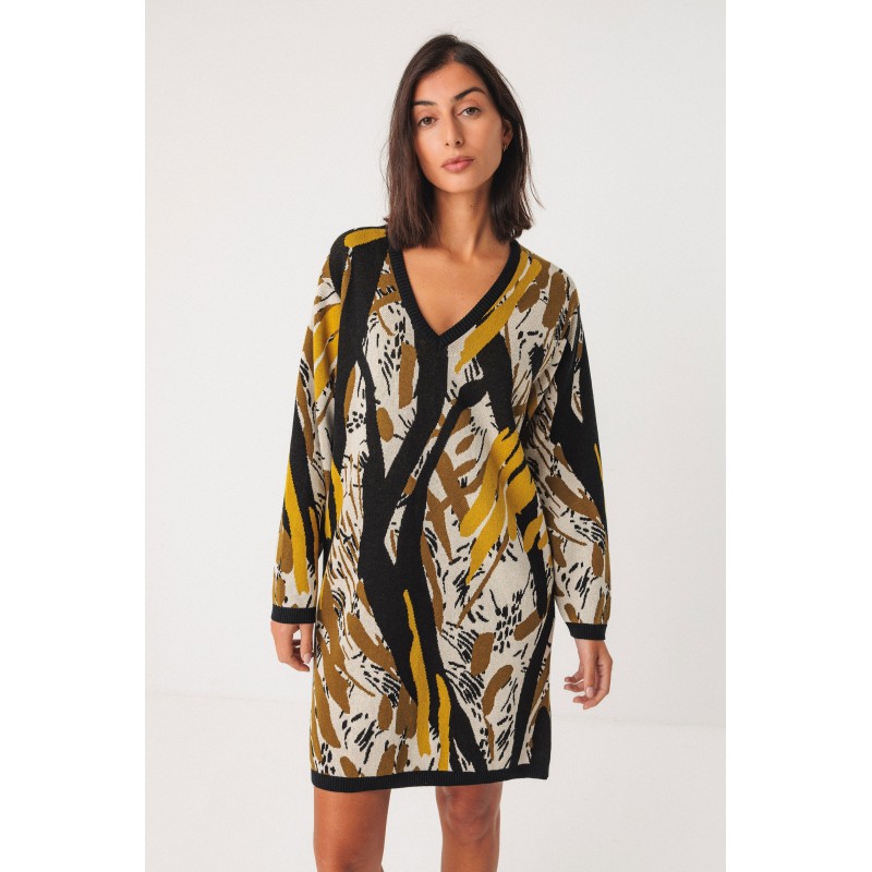 Vestido de malha com estampa jacquard e comprimento acima do joelho. Possui caimento solto, decote em V e mangas longas e amplas.
