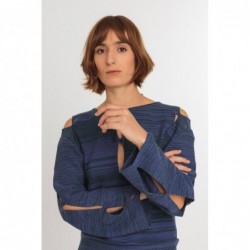 Vestido midi justo com mangas longas e detalhe de nó frontal. Fácil de vestir e com fendas decorativas nas mangas.