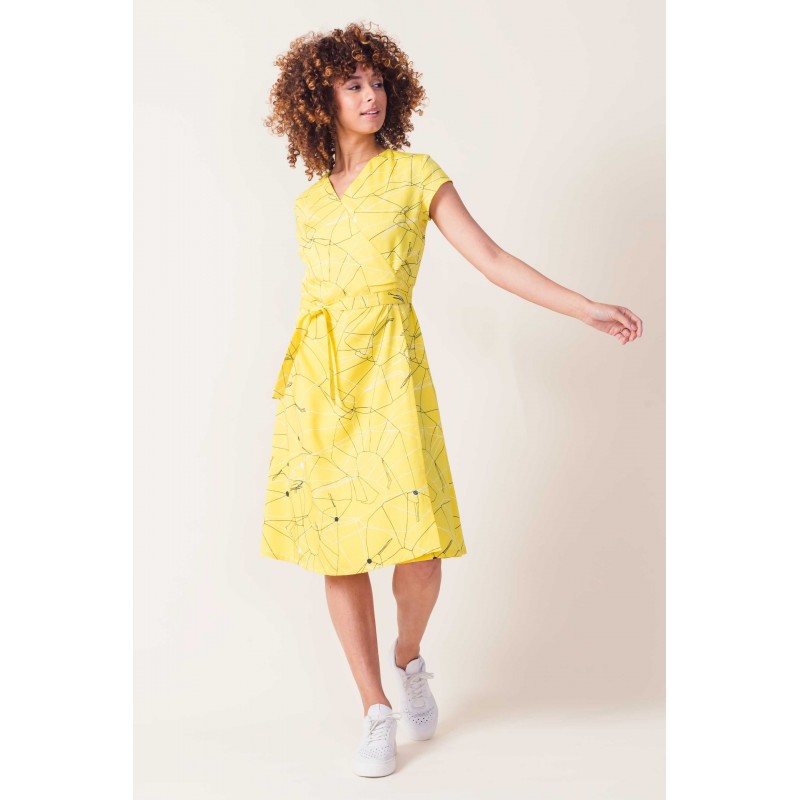 Nosso vestido exclusivo com a estampa amarela vibrante "kiski" é o toque final perfeito para este vestido envelope. Ajuste-o ao seu tamanho e brilhe o dia todo.