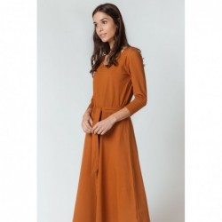 Vestido longo com gola redonda, saia evasê e mangas 3/4. Confeccionado em algodão elástico, possui cinto removível para ajuste na cintura.