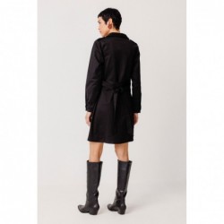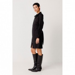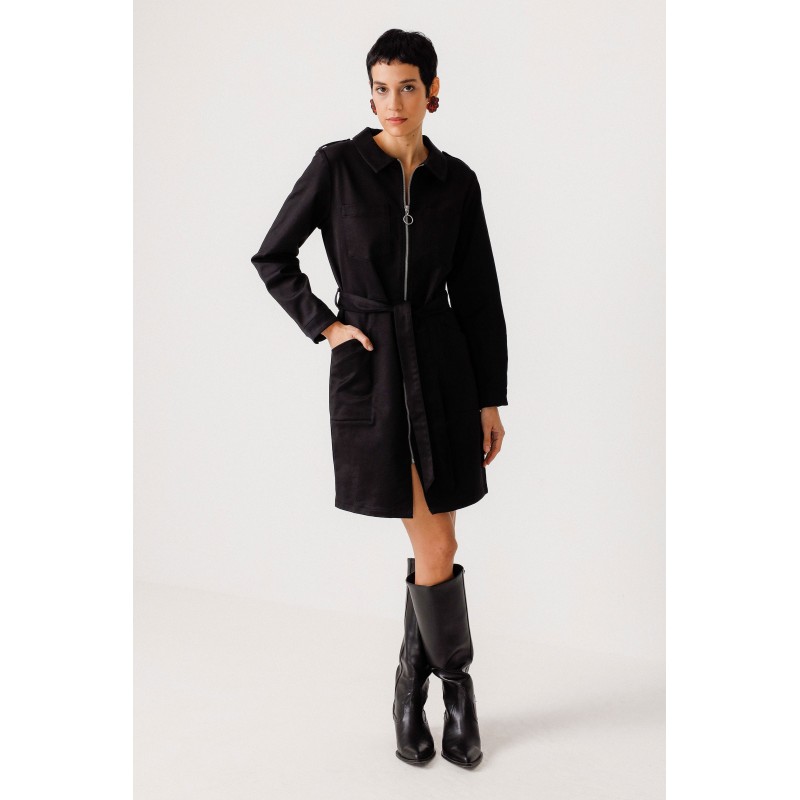 Vestido reto com gola de camisa, mangas compridas com punhos abotoados, fecho frontal com zíper, bolsos frontais e cinto com nó.