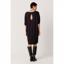 Um vestido solto, na altura do joelho, com gola redonda e mangas morcego, desenhado para ser fácil de vestir. Possui um detalhe em forma de lágrima nas costas.