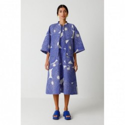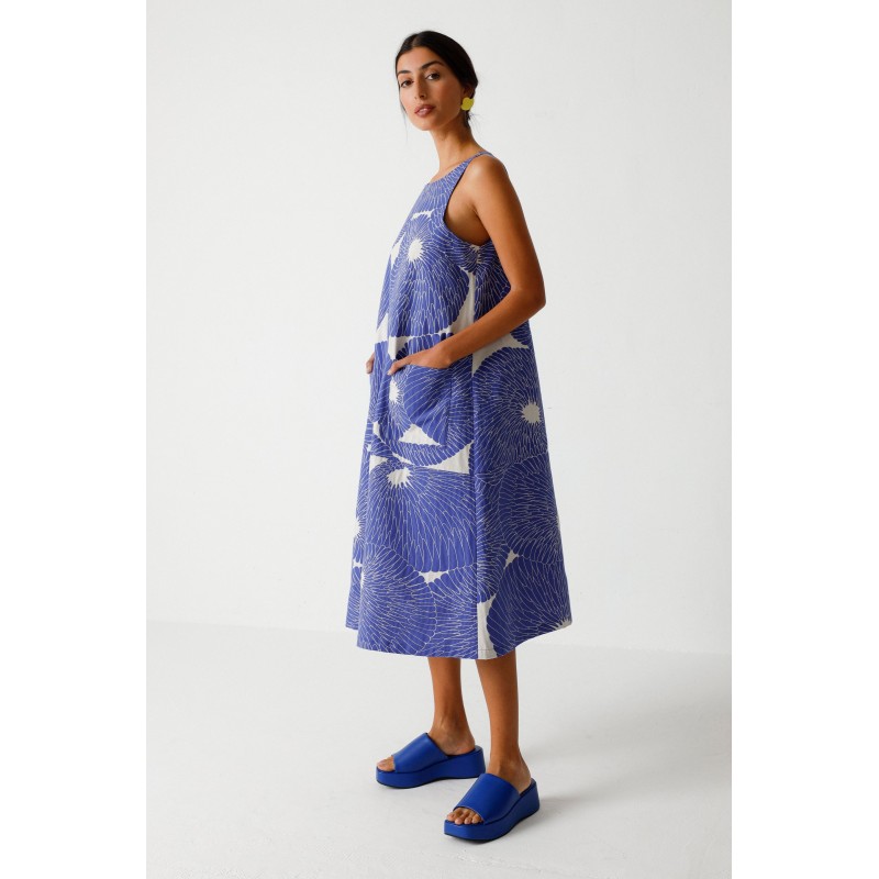 Vestido elegante sem mangas com estampa jacquard marcante. Modelagem em A e comprimento midi, bolsos frontais e fechamento em zíper nas costas. Estampa oriental.