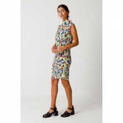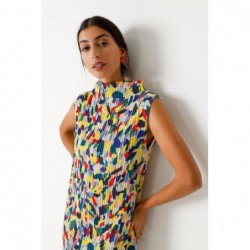 Vestido elegante sem mangas em tecido plissado fino. Gola alta e comprimento acima do joelho. Estampa multicolorida.