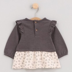 Este vestido de duas peças da coleção Cosmos foi concebido para oferecer um estilo delicado e encantador. A parte de cima, lisa e macia, contrasta com a saia estampada com pequenas estrelas, criando um look equilibrado e cheio de personalidade. Ideal para o dia a dia, possui um design confortável e fácil de vestir.